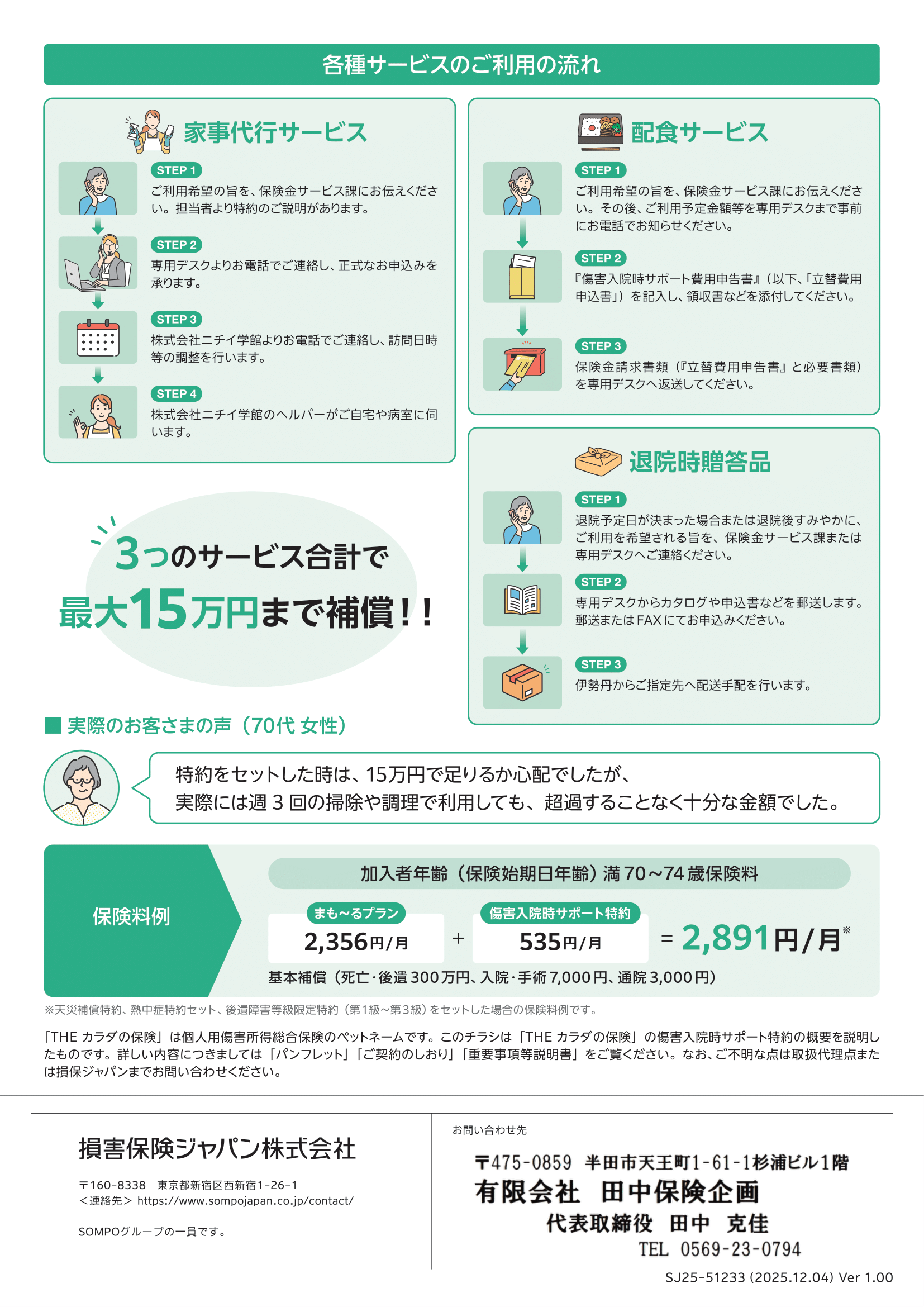 冬は服装が厚着になり動きにくく、寒さにより筋肉も思うように動かなくなるため、転倒事故が増えるといわれています。高齢者の転倒事故は、骨折が原因で入院・介護が必要になる場合も少なくありません。 『THE カラダの保険』まも~るプランはシニアの健康を応援!傷害入院時サポート特約で万が一の入院時の不安を解消できます。 ◆ 損保ジャパンHP 『THE カラダの保険』まも~るプラン ◆ 日常生活の安心・安全に繋がる補償での備えを、この機会にご検討ください。 ※こちらのご案内は概要になります。詳しくは弊社までお気軽にお問合せ下さい。